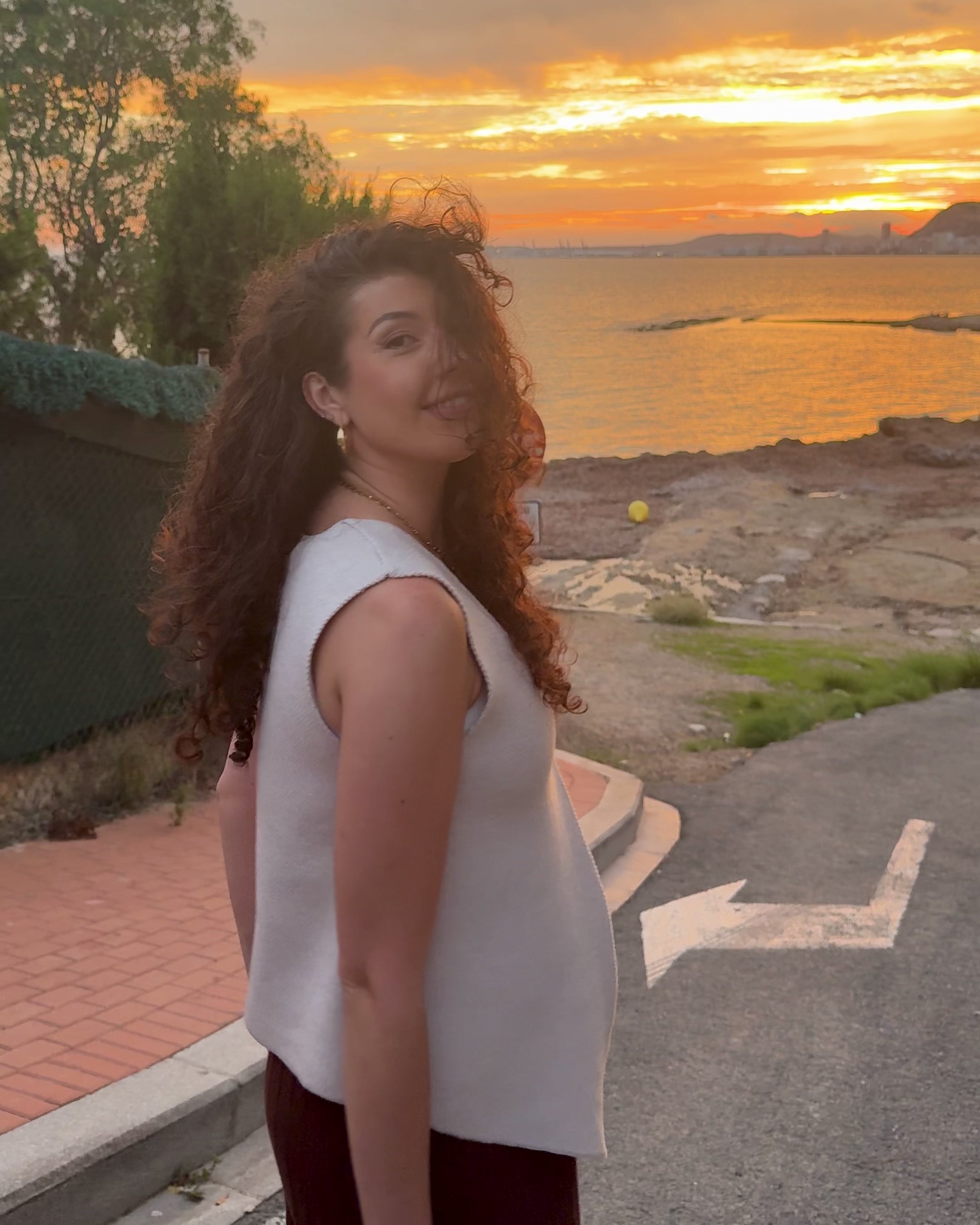 Su tono beige aporta calma y luminosidad, y su corte asimétrico con acabado en pico estiliza la silueta con naturalidad. El escote en V enmarca el rostro y el botón central suma ese brillo sutil que recuerda la claridad del alba.