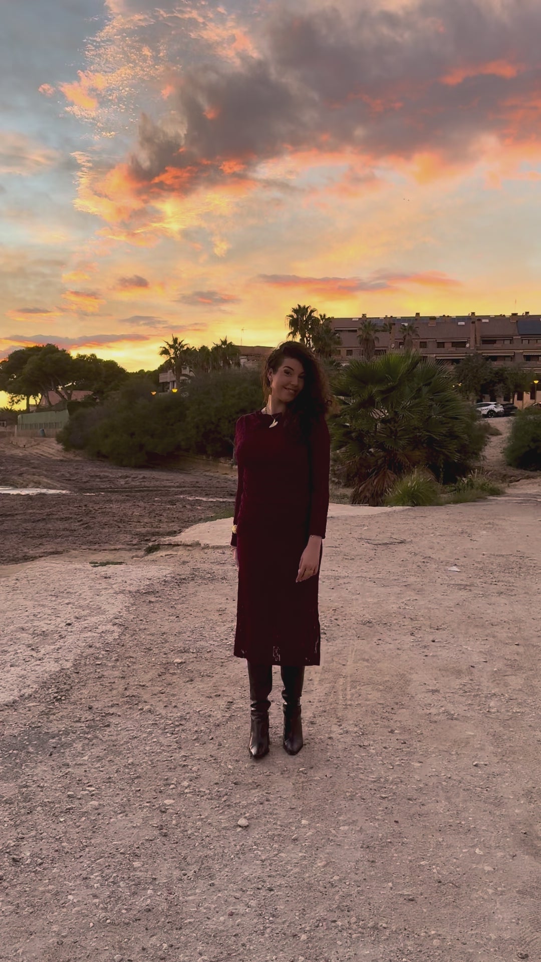 Encaje profundo en tono vino, con caída suave y movimiento, Cintura elástica que se adapta sin apretar, forro interior para ir cómoda y abertura lateral que deja asomar lo justo al caminar.